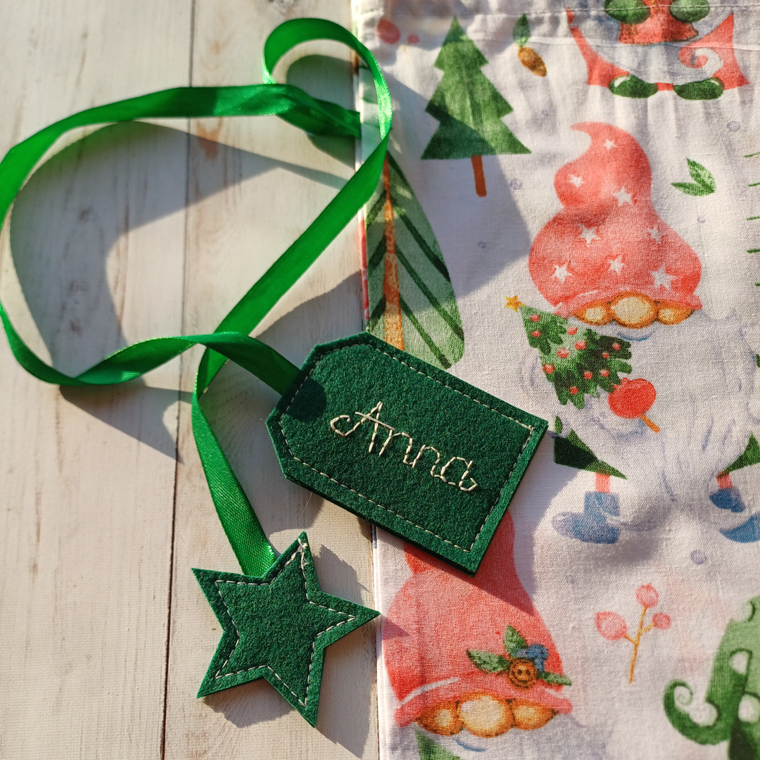 100% pamutvászon, szatén vagy ripsz kötözőszalaggal és filcből készült ajándékkísérővel, amire nevesítés esetén kézzel hímzem rá a kért nevet.